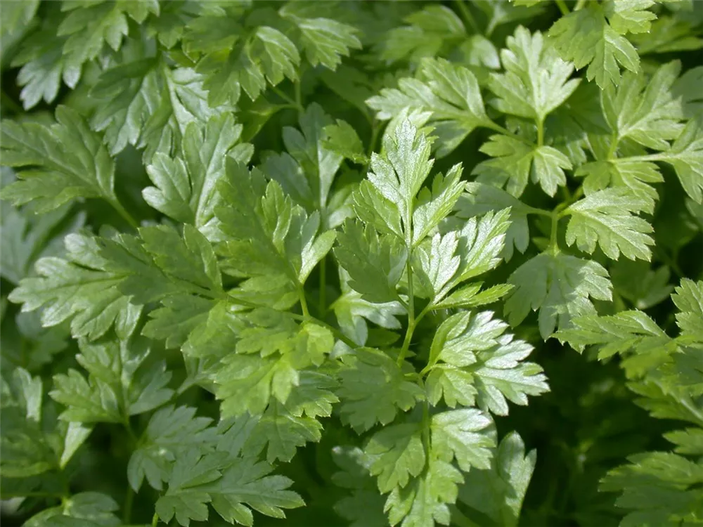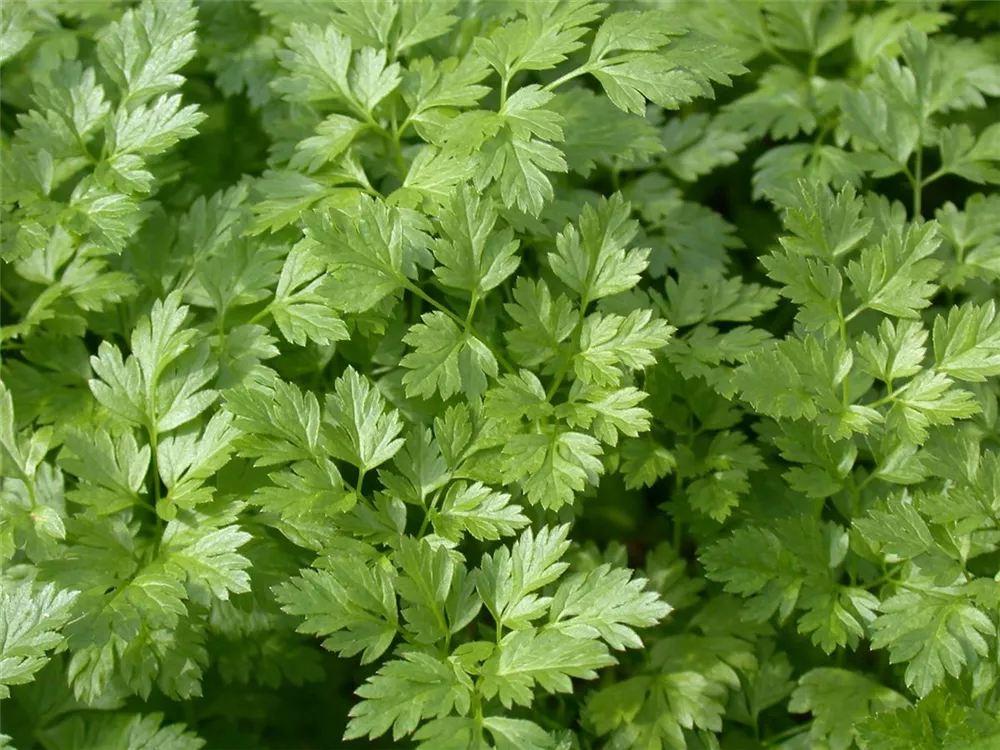 Zum Verzehr geeignet. Die dunkelgrünen, gesägten Blätter sind gefiedert und überzeugen mit aromatischem Geschmack.