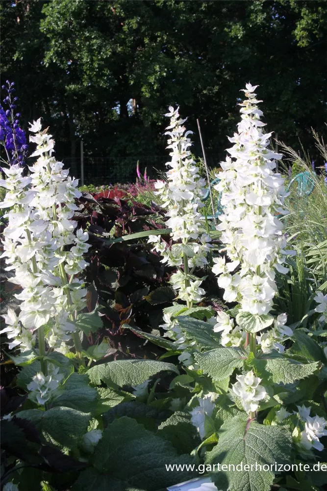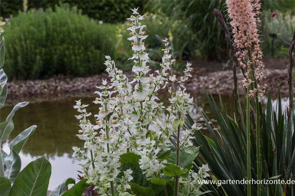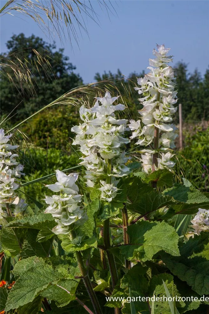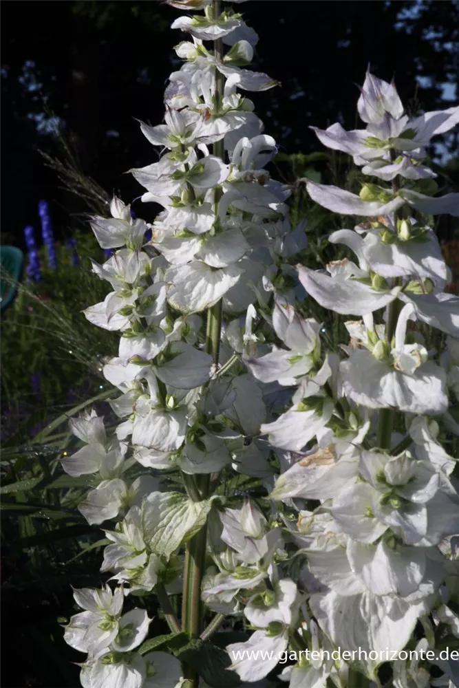 Salvia sclarea var. turkestanica 'Vatican White' bildet in Rispen angeordnete, weiße Blüten ab Juni. Diese verströmen einen angenehmen Duft.