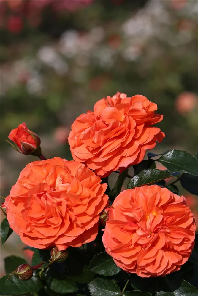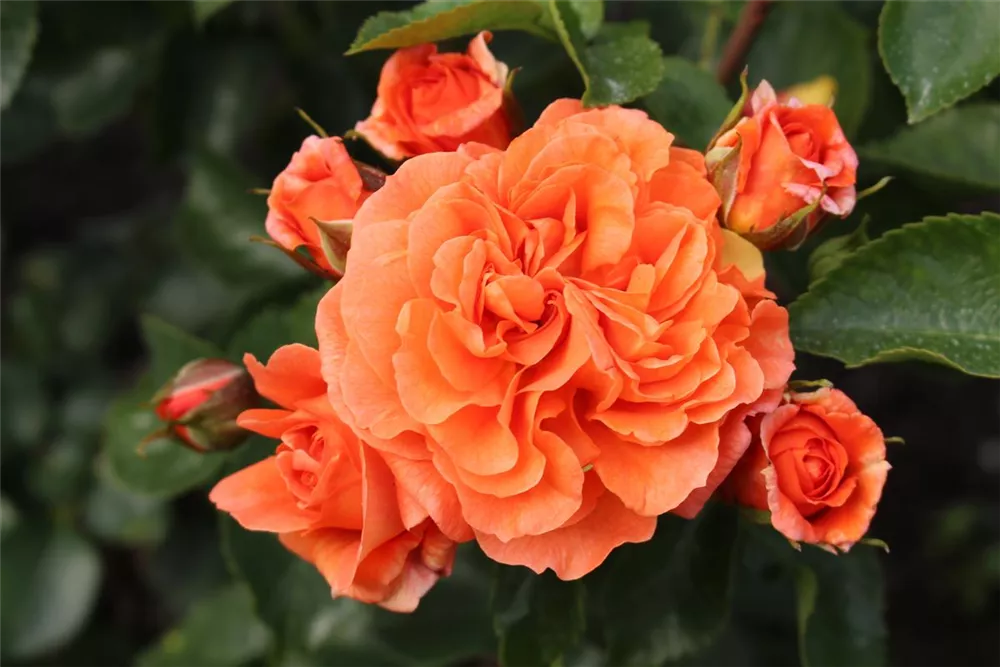 Die Beetrose 'Orangerie'® (Rosa) ist eine reichblühende Rose, die im Garten eine besondere Rolle spielt. Die zahlreichen starkgefüllten Blüten sind orange und erscheinen von Juni bis September. Ihr wunderbarer Duft entfaltet sich besonders an sonnigen, warmen Tagen. Mit den richtigen Begleitern an ihrer Seite, kommt die Königin der Blumen besonders gut zur Geltung. Niedrige Stauden, Lavendel und Salbei eignen sich ganz gut für diese Zwecke.