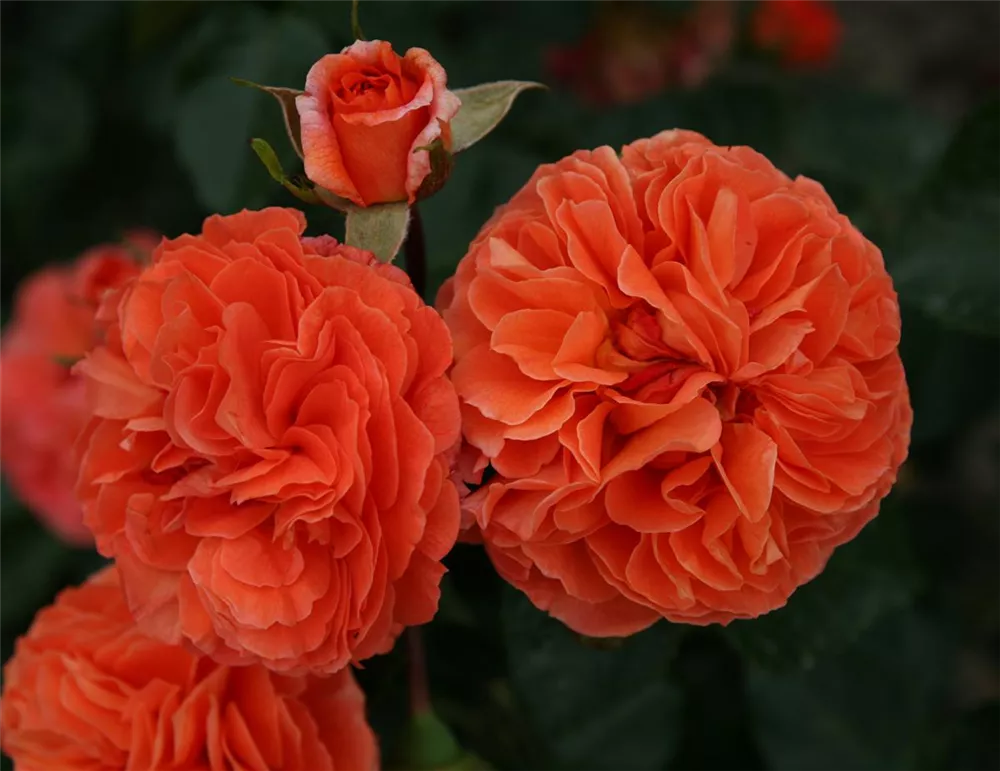 Die orangefarbenen, starkgefüllten, schalenförmigen Blüten der Beetrose 'Orangerie'® erscheinen in Dolden von Juni bis September. Diese werden etwa 7 - 8 cm groß und sind leicht duftend.