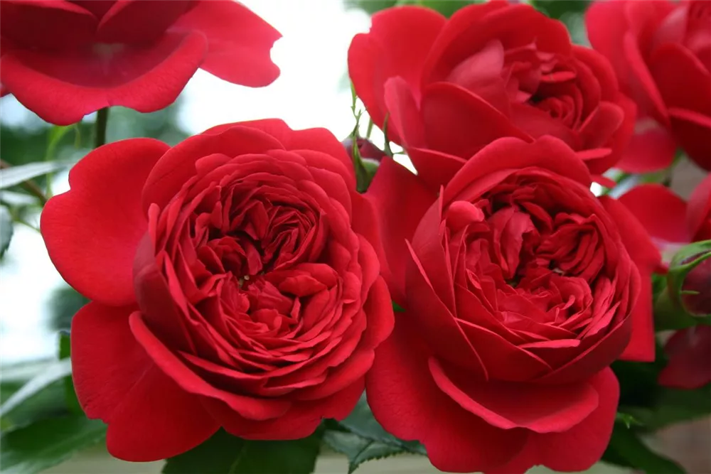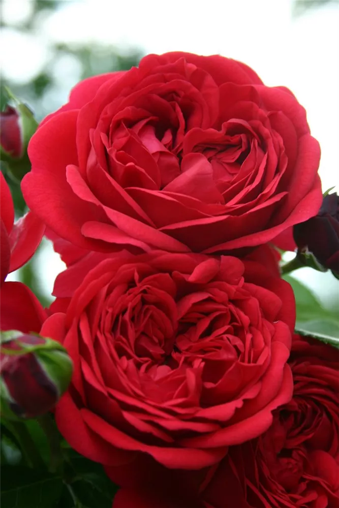Die roten, starkgefüllten, schalenförmigen Blüten der Beetrose 'Out of Rosenheim'® erscheinen in Dolden von Juni bis September. Diese werden etwa 6 - 8 cm groß.