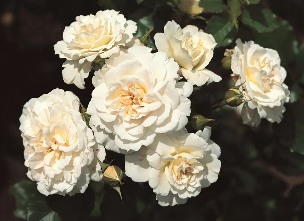 Die cremeweißen, starkgefüllten, schalenförmigen Blüten der Beetrose 'Petticoat'® erscheinen in Dolden von Juni bis September. Diese werden etwa 6 - 7 cm groß und sind leicht duftend.