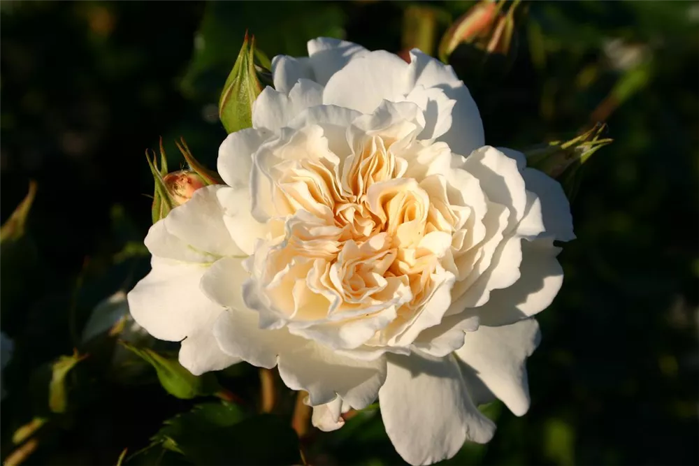 Die Beetrose 'Petticoat'® (Rosa) ist eine reichblühende Rose, die im Garten eine besondere Rolle spielt. Die zahlreichen starkgefüllten Blüten sind cremeweiß und erscheinen von Juni bis September. Ihr wunderbarer Duft entfaltet sich besonders an sonnigen, warmen Tagen. Mit den richtigen Begleitern an ihrer Seite, kommt die Königin der Blumen besonders gut zur Geltung. Niedrige Stauden, Lavendel und Salbei eignen sich ganz gut für diese Zwecke.