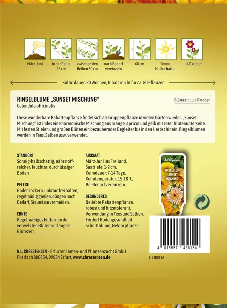 Die Ringelblume 'Sunset Mischung' ist zur Gruppenbepflanzung, aber auch in Medizin, im Steingarten, im Bauerngarten, als Bienenweide, im Rosengarten oder in Homöopathie sehr beliebt.