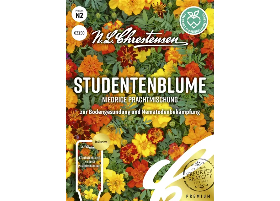 Tagetes erecta 'Niedrige Prachtmischung' bildet während der gesamten Saison zahlreiche cremeweiße, gelbe, orangefarbene Blüten. Diese verströmen einen leichten Duft.