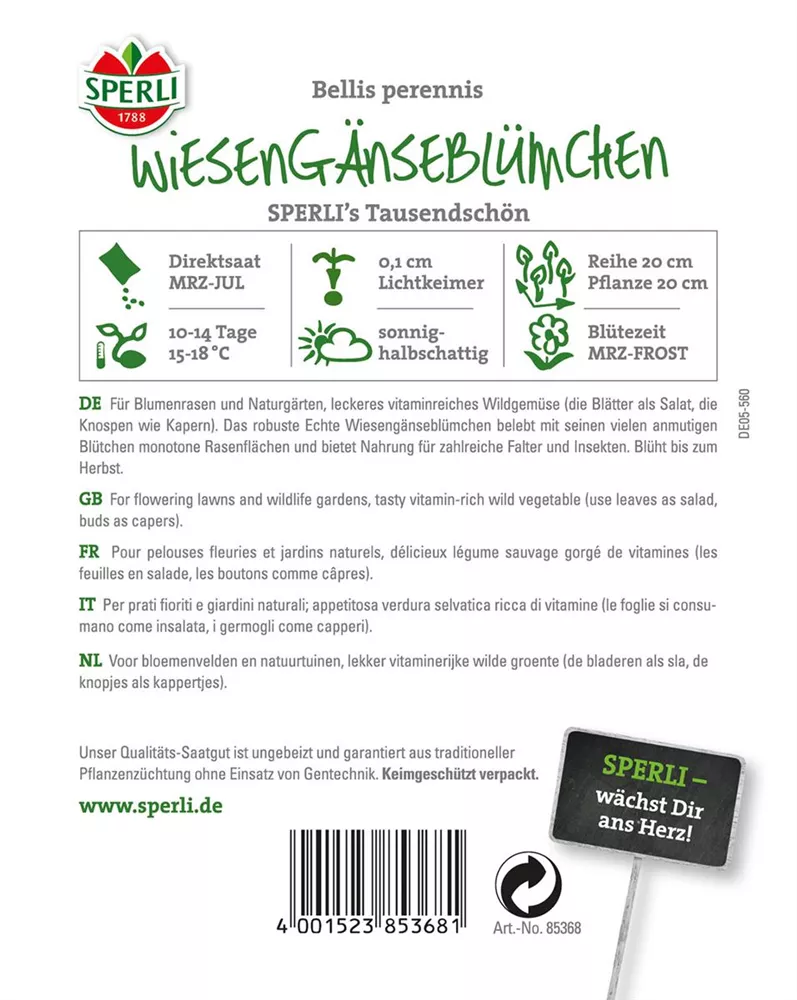 Das Gänseblümchen (Bellis perennis) ist eine rosettenartige Staude, die, je nach Sorte, Blüten in verschiedenen Farben bildet. An einem sonnigen bis halbschattigen Standort mit durchlässigem, nährstoffreichem Boden erreicht es gewöhnlich eine Höhe von ca. 20 cm und wird ca. 20 cm breit. Das Gänseblümchen ist gut frostverträglich.