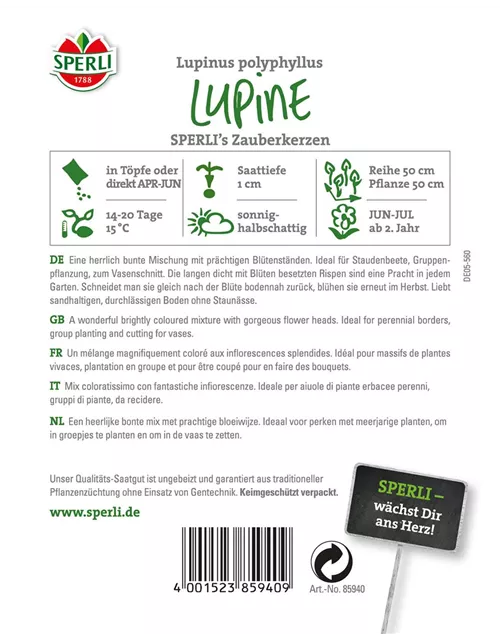 Die Garten-Lupine 'Zauberkerze' (Lupinus polyphyllus) ist eine buschige, aufrechte Staude, die von Juni bis September bunte Blüten mit einem angenehmen Duft bildet. An einem sonnigen Standort mit durchlässigem, kalkfreiem Boden erreicht sie gewöhnlich eine Höhe von ca. 1 m und wird ca. 60 cm breit. Die Garten-Lupine 'Zauberkerze' ist gut frostverträglich.