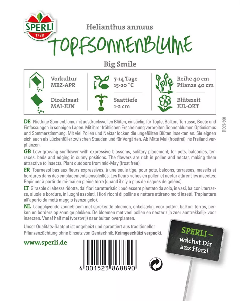 Die Sonnenblume 'Big Smile' (Helianthus annuus) ist eine beliebte Pflanze für den Balkon, die während der gesamten Saison unzählige gelbe Blüten bildet. Ein sonniger Standort und ein durchlässiges Substrat werden bevorzugt.
