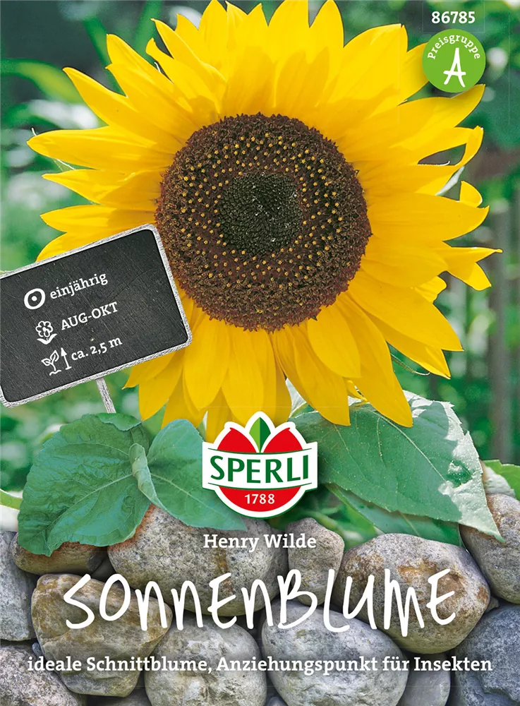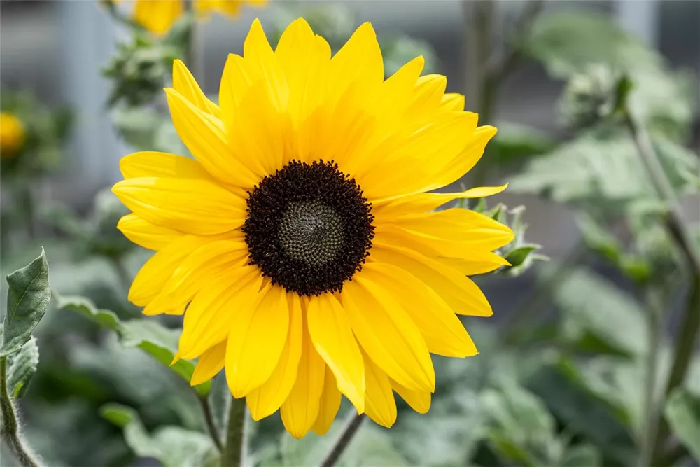Die Sonnenblume 'Henry Wilde' (Helianthus annuus) ist eine beliebte Pflanze für den Balkon, die während der gesamten Saison unzählige gelbe Blüten bildet. Ein sonniger Standort und ein durchlässiges Substrat werden bevorzugt.