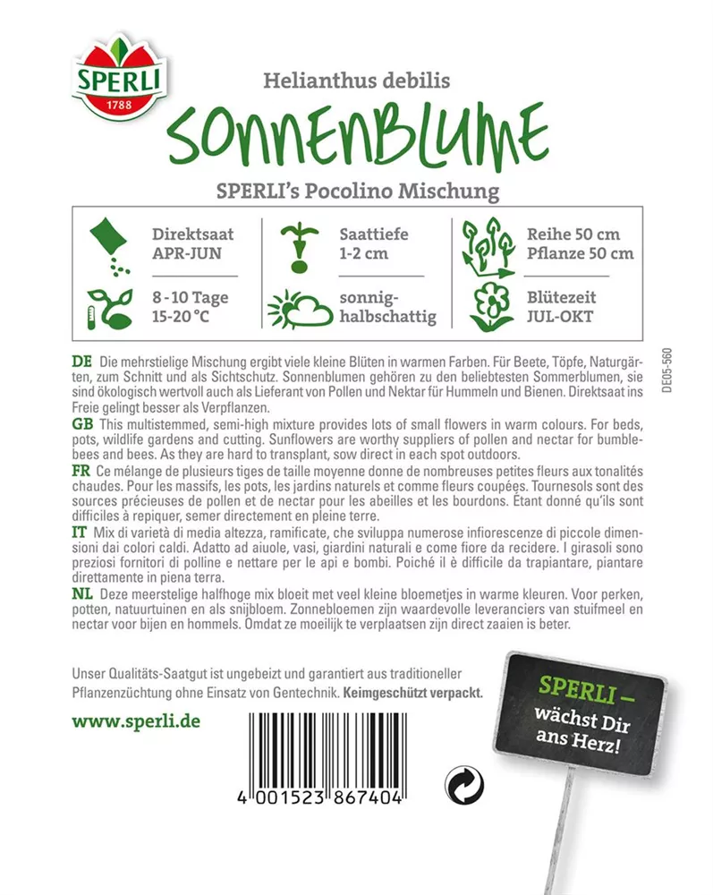 Die Sonnenblume 'Pocolino' (Helianthus debilis) ist eine beliebte Pflanze für den Balkon, die während der gesamten Saison unzählige mehrfarbige Blüten bildet. Ein sonniger Standort und ein durchlässiges Substrat werden bevorzugt.