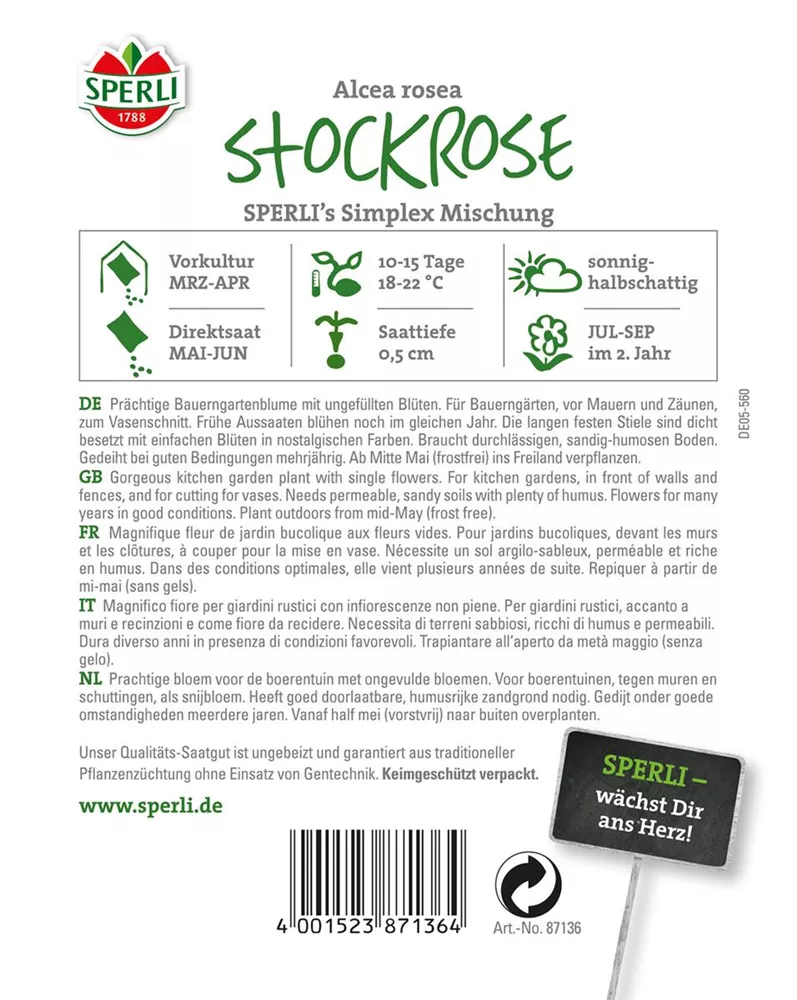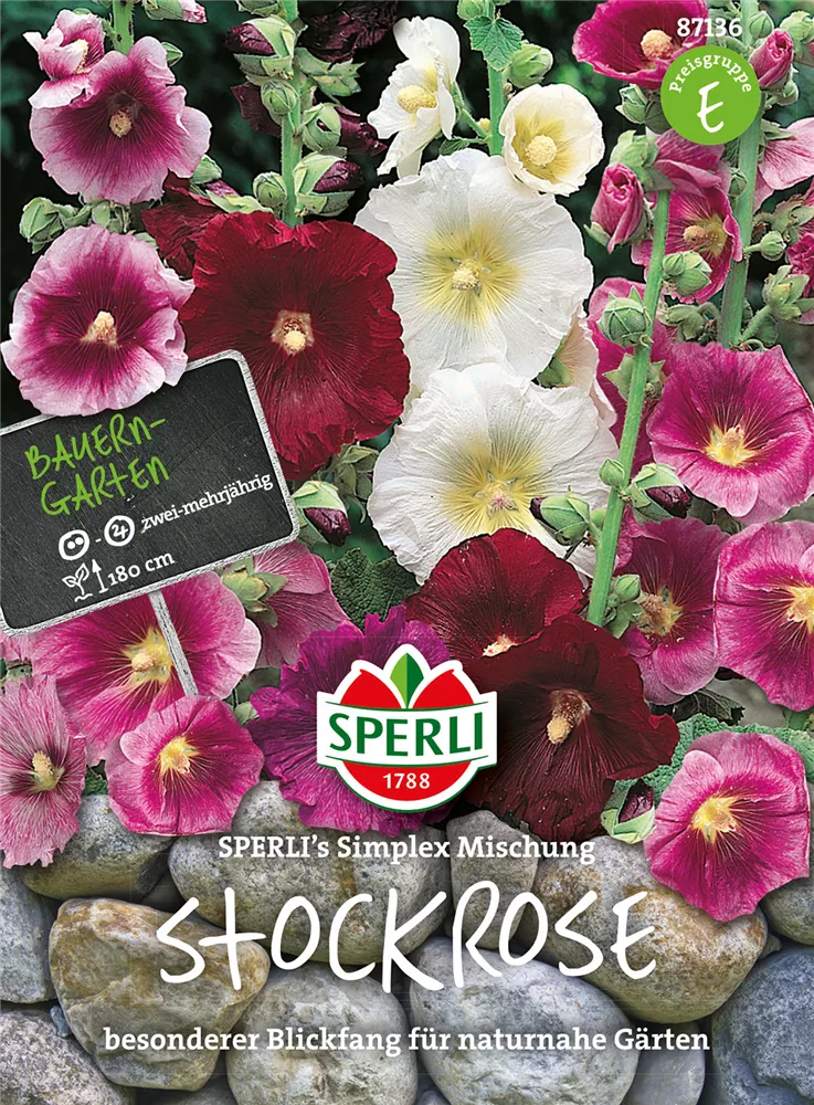 Die Einfachblühende Stockrose 'Simplex' (Alcea rosea) ist eine aufrechte, horstbildende Staude, die, je nach Sorte, schalenförmige Blüten in verschiedenen Farben bildet. An einem sonnigen Standort mit durchlässigem Boden erreicht sie gewöhnlich eine Höhe von ca. 1,8 m und wird ca. 60 cm breit. Die Einfachblühende Stockrose 'Simplex' ist gut frostverträglich.