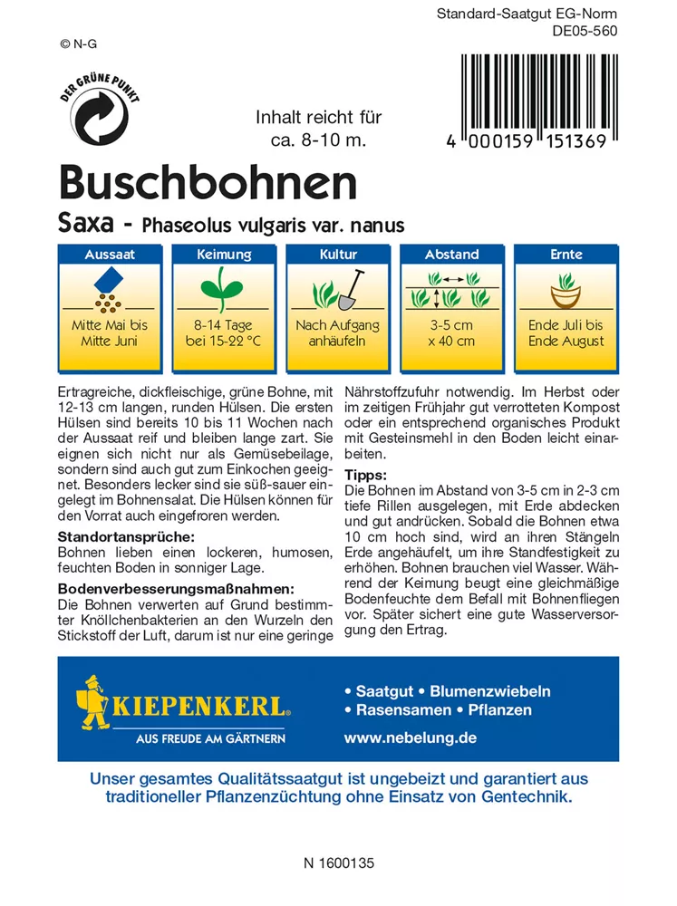 Die grünen Hülsenfrüchte haben einen aromatischen Geschmack. Reifezeit ab Juli. Die Hülsenfrüchte sind länglich.