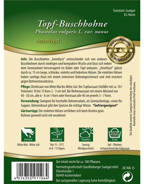 Die Buschbohne 'Amethyst' (Phaseolus vulgaris) bildet Hülsenfrüchte, die aromatisch schmecken und bereits ab Juli geerntet werden können. Für das optimale Wachstum der Buschbohne 'Amethyst' werden ein sonniger Standort und durchlässiger, nährstoffreicher Boden benötigt.
