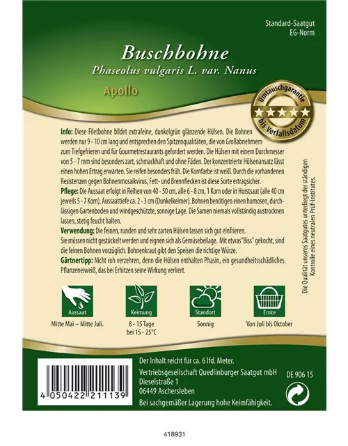 Die Buschbohne 'Apollo' ist im Gemüsegarten, aber auch für Salat, für Fleischgerichte, zu Fischgerichten oder für Suppen & Eintöpfe sehr beliebt.
