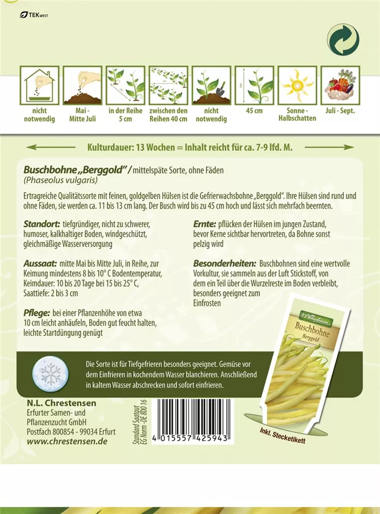 Die Busch-Bohne 'Berggold' ist im Gemüsegarten, aber auch für Salat, für Fleischgerichte, zu Fischgerichten oder für Suppen & Eintöpfe sehr beliebt.