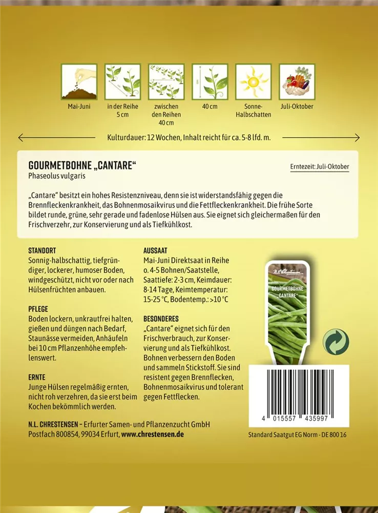 Die Buschbohne 'Cantare' ist im Gemüsegarten, aber auch für Salat, für Fleischgerichte, zu Fischgerichten oder für Suppen & Eintöpfe sehr beliebt.
