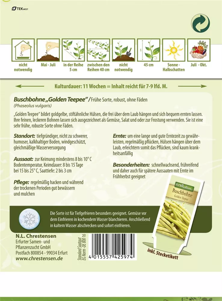 Die gelben Hülsenfrüchte haben einen aromatischen Geschmack. Reifezeit ab Juli.Die Hülsenfrüchte sind länglich.