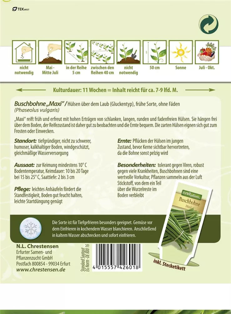 Die grünen Hülsenfrüchte haben einen aromatischen Geschmack. Reifezeit ab Juli.Die Hülsenfrüchte sind länglich.