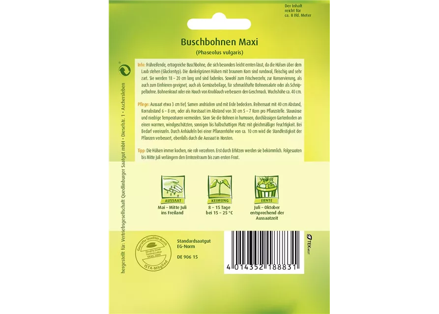 Die grünen Hülsenfrüchte haben einen aromatischen Geschmack. Reifezeit ab Juli.Die Hülsenfrüchte sind länglich.