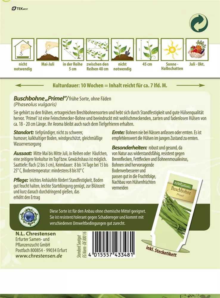 Die Busch-Bohne 'Primel' ist im Gemüsegarten, aber auch für Salat, für Fleischgerichte, zu Fischgerichten oder für Suppen & Eintöpfe sehr beliebt.