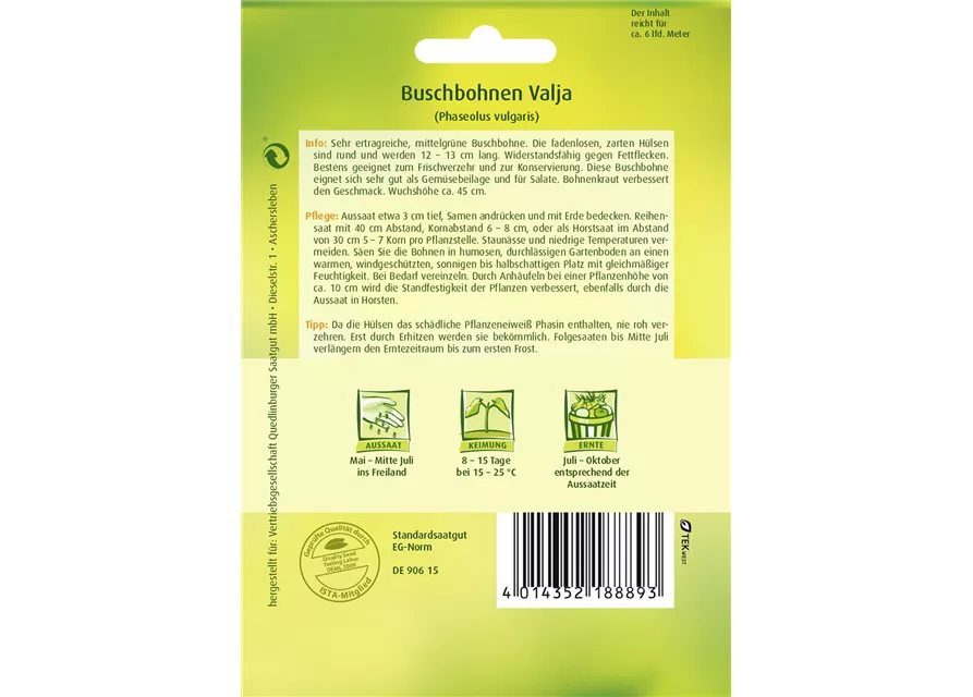 Die mittelgrünen Hülsenfrüchte haben einen aromatischen Geschmack. Reifezeit ab Juli.Die Hülsenfrüchte sind länglich.