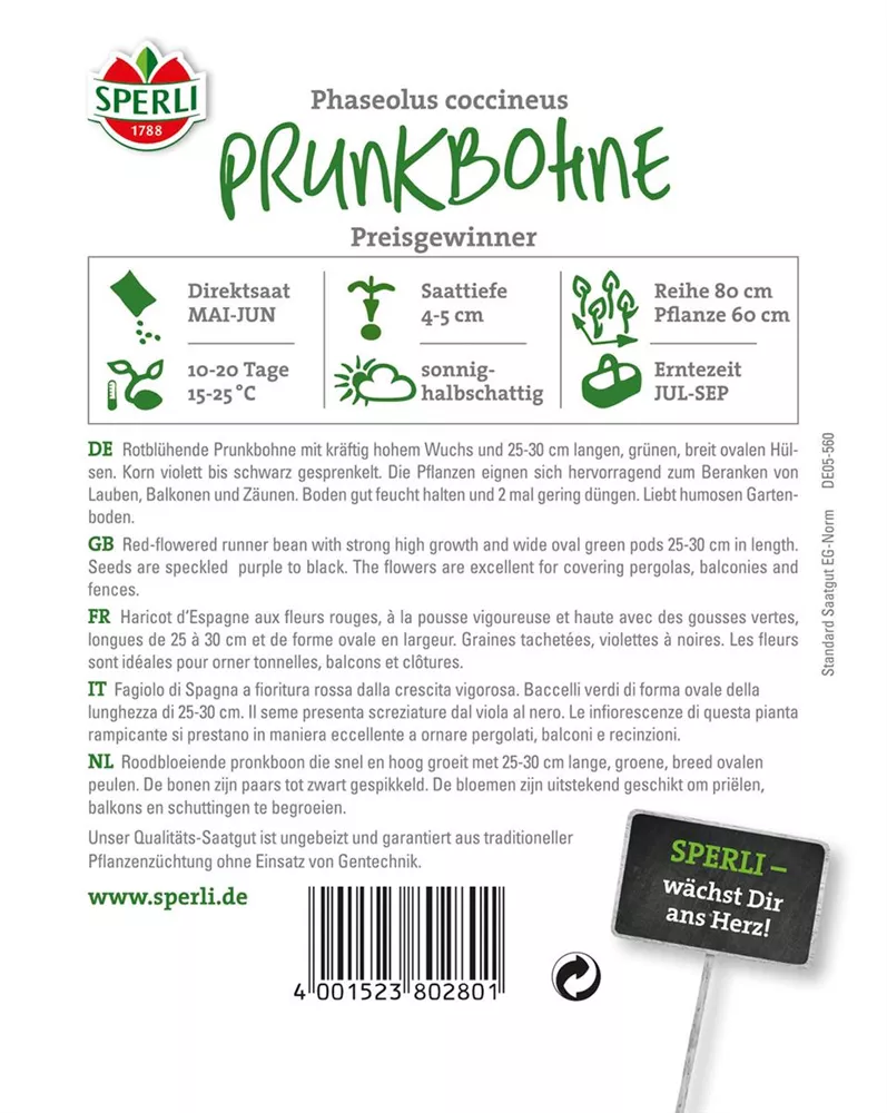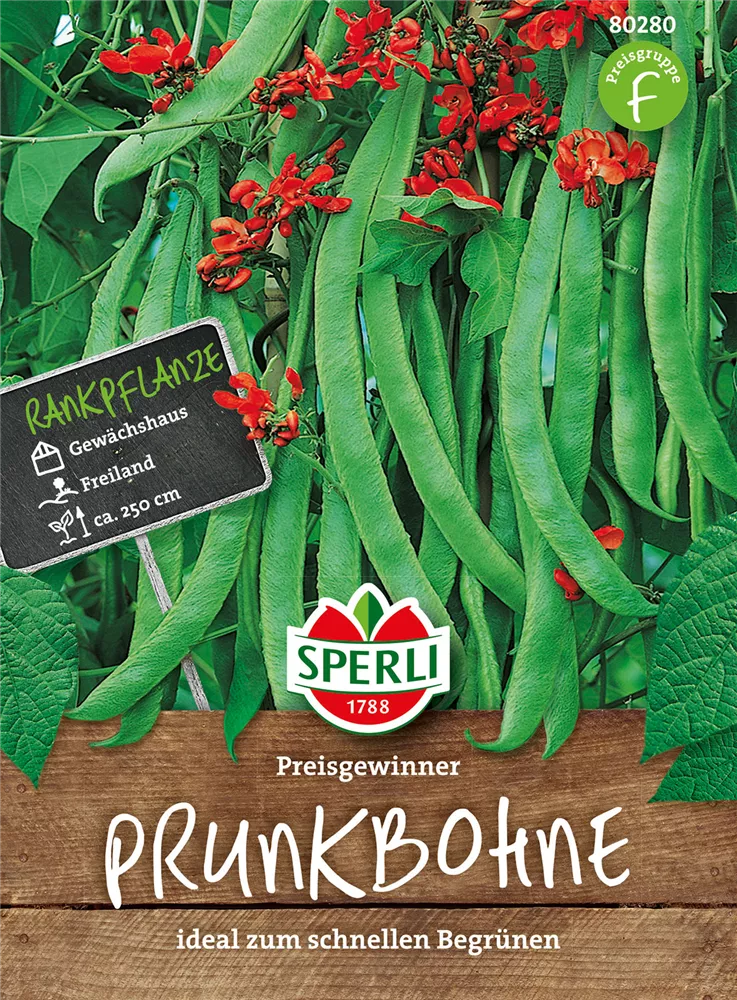 Die Prunk-Bohne 'Preisgewinner' (Phaseolus coccineus) bildet Früchte, die aromatisch schmecken und bereits ab Juli geerntet werden können. Für das optimale Wachstum der Prunk-Bohne 'Preisgewinner' werden ein sonniger Standort und durchlässiger, nährstoffreicher Boden benötigt.