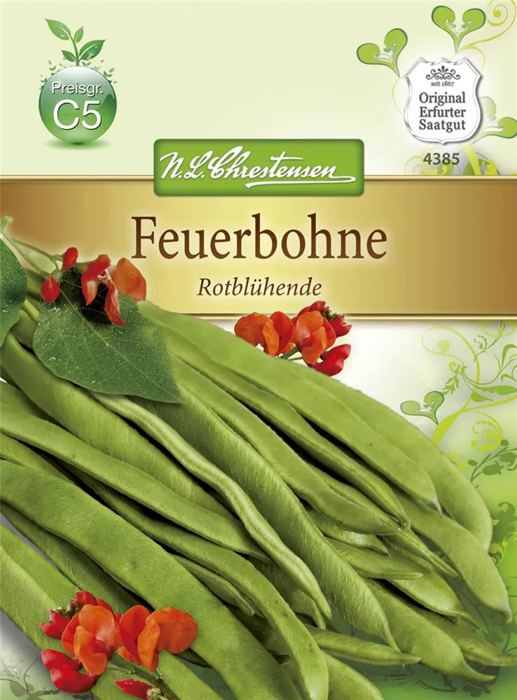 Prunkbohne 'Rotblühende' ist auch unter diesem Namen bekannt: Feuer-Bohne, Woll-Bohne oder Käfer-Bohne