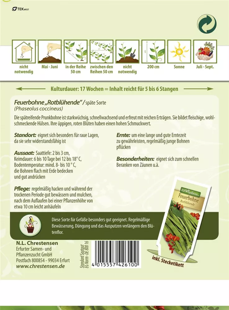 Die Prunkbohne 'Rotblühende' ist im Gemüsegarten, aber auch zum Verzehr, zum Kochen, für Salat oder für Suppen & Eintöpfe sehr beliebt.