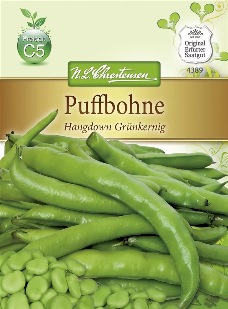 Die Puffbohne 'Hangdown Grünkernig' (Vicia faba) bildet Samenkörner, die aromatisch schmecken und bereits ab Juli geerntet werden können. Für das optimale Wachstum der Puffbohne 'Hangdown Grünkernig' werden ein sonniger Standort und durchlässiger, nährstoffreicher Boden benötigt.