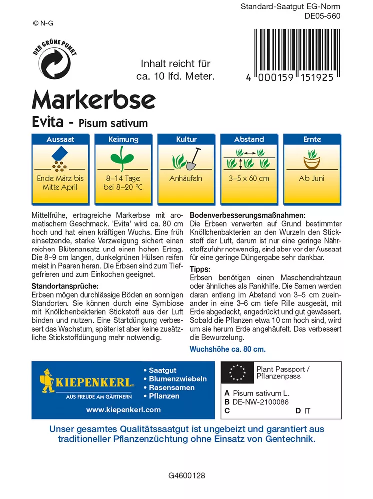 Markerbse 'Evita' ist auch unter diesem Namen bekannt: Gartenerbse oder Speiseerbse.