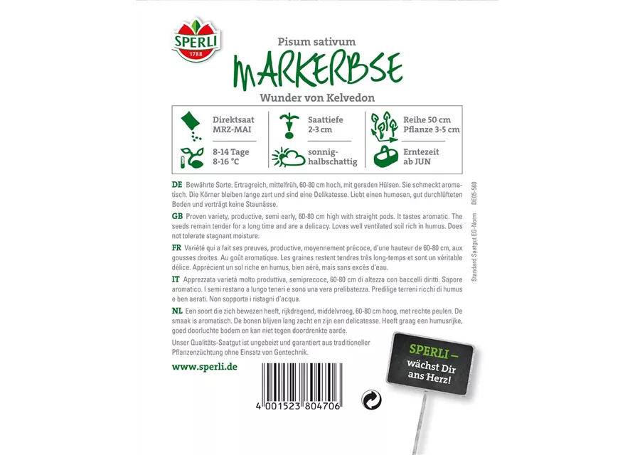 Die Markerbse 'Wunder von Kelvedon' (Pisum sativum) bildet Samenkörner, die süß, aromatisch schmecken und bereits ab Juni geerntet werden können. Für das optimale Wachstum der Markerbse 'Wunder von Kelvedon' werden ein sonniger Standort und durchlässiger, nährstoffreicher Boden benötigt.