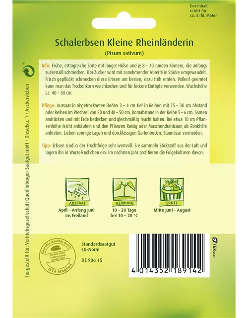 Die Schal-Erbse 'Kleine Rheinländerin' (Pisum sativum) bildet Samenkörner, die süß, mehlig schmecken und bereits ab Juni geerntet werden können. Für das optimale Wachstum der Schal-Erbse 'Kleine Rheinländerin' werden ein sonniger Standort und durchlässiger, nährstoffreicher Boden benötigt.