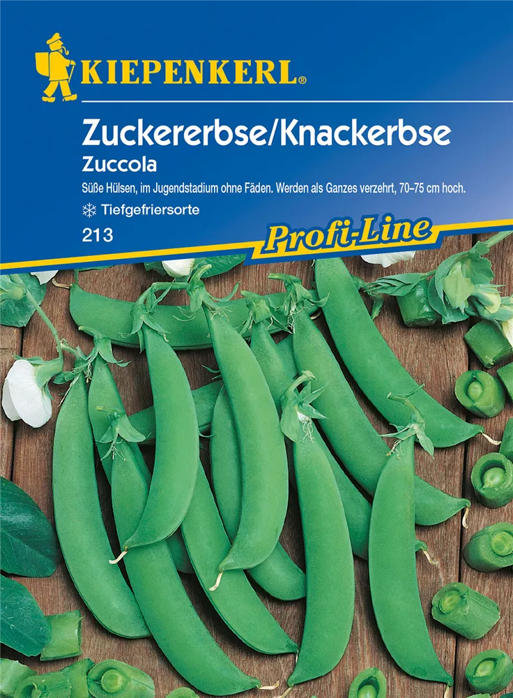 Die Zuckererbse 'Zuccola' (Pisum sativum) bildet Hülsenfrüchte, die süß schmecken und bereits ab Juni geerntet werden können. Für das optimale Wachstum der Zuckererbse 'Zuccola' werden ein sonniger Standort und durchlässiger, nährstoffreicher Boden benötigt.