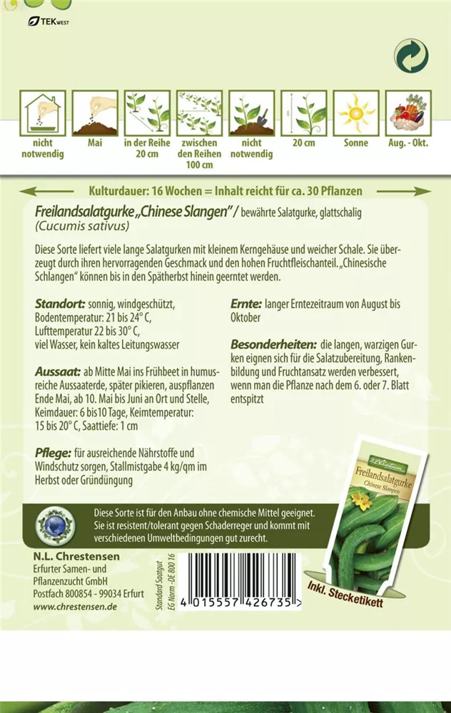 Die Gurke 'Chinese Slangen' (Cucumis sativus) bildet Früchte, die aromatisch schmecken und bereits ab August geerntet werden können. Für das optimale Wachstum der Gurke 'Chinese Slangen' werden ein sonniger Standort und durchlässiger, nährstoffreicher Boden benötigt.