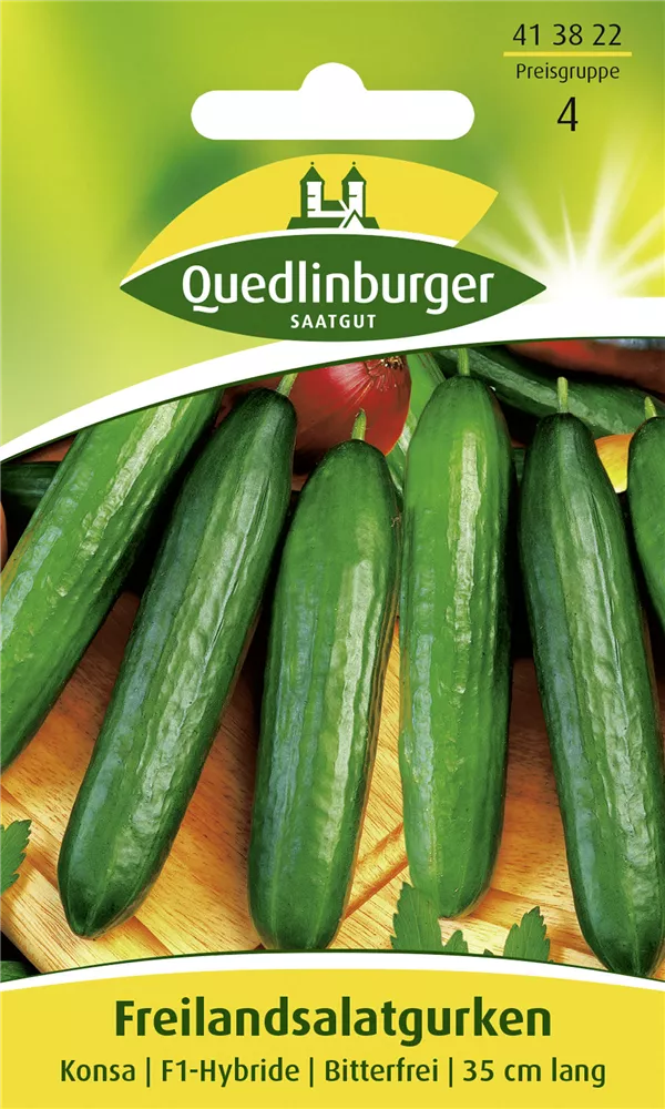 Die Gurke 'Konsa F1' (Cucumis sativus) bildet Früchte, die aromatisch schmecken und bereits ab Juli geerntet werden können. Für das optimale Wachstum der Gurke 'Konsa F1' werden ein sonniger Standort und durchlässiger, nährstoffreicher Boden benötigt.