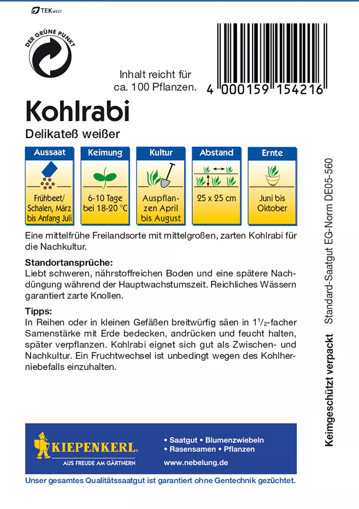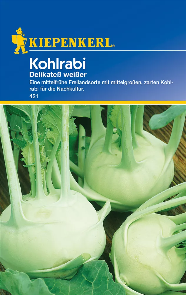 Der Kohlrabi 'Weißer Delikateß' (Brassica oleracea var. gongylodes) bildet Knollen, die aromatisch schmecken und bereits ab Juni geerntet werden können. Für das optimale Wachstum des Kohlrabis 'Weißer Delikateß' werden ein sonniger Standort und durchlässiger, nährstoffreicher Boden benötigt.