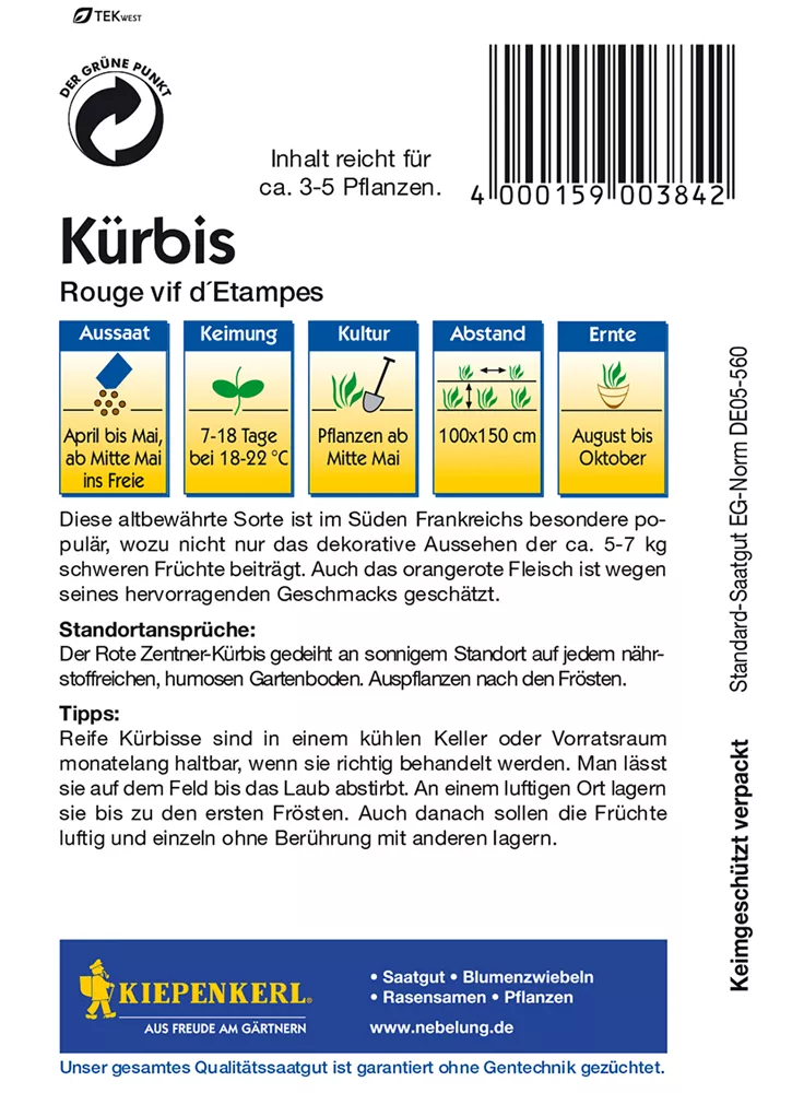 Samen 1 - 2 cm mit Erde bedecken. Die Keimung erfolgt innerhalb von 7 - 18 Tagen bei 18 - 22°C Bodentemperatur.