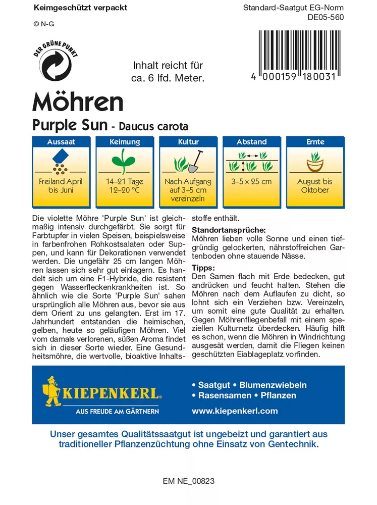Die Möhre 'Purple Sun' (Daucus carota var. sativus) bildet Wurzeln, die aromatisch schmecken und bereits ab Juni geerntet werden können. Für das optimale Wachstum der Möhre 'Purple Sun' werden ein sonniger Standort und durchlässiger, nährstoffreicher Boden benötigt.