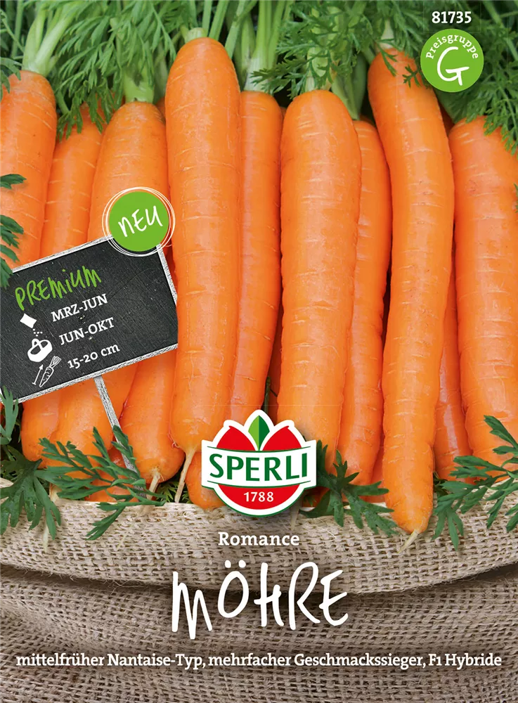 Die Möhre 'Romance' (Daucus carota var. sativus) bildet Wurzeln, die aromatisch schmecken und bereits ab Juni geerntet werden können. Für das optimale Wachstum der Möhre 'Romance' werden ein sonniger Standort und durchlässiger, nährstoffreicher Boden benötigt.