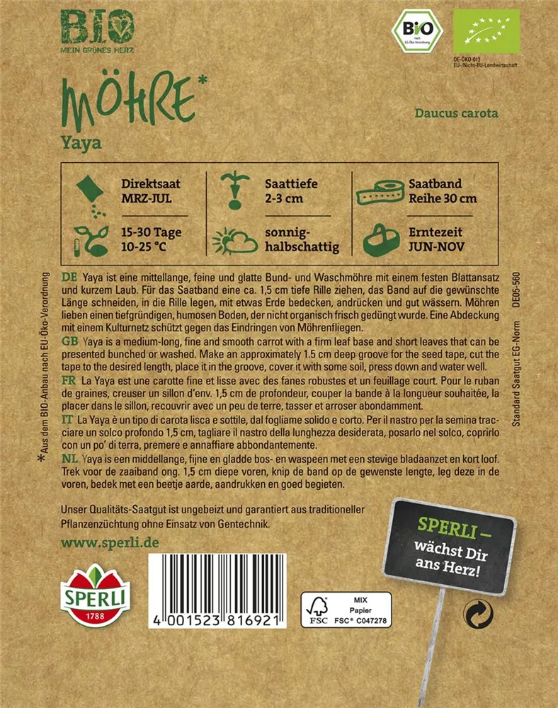 Die Möhre 'Yaya' (Daucus carota var. sativus) bildet Wurzeln, die aromatisch schmecken und bereits ab Juni geerntet werden können. Für das optimale Wachstum der Möhre 'Yaya' werden ein sonniger Standort und durchlässiger, nährstoffreicher Boden benötigt.