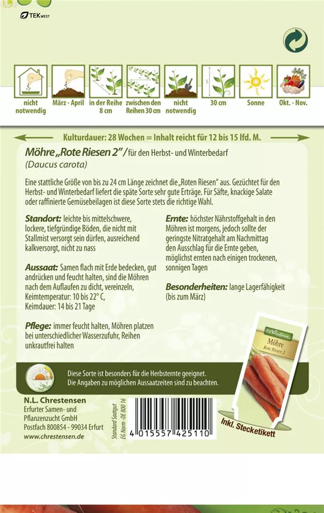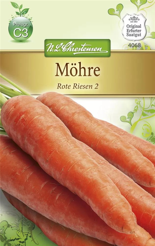 Die Möhre 'Rote Riesen 2' (Daucus carota var. sativus) bildet Wurzeln, die aromatisch schmecken und bereits ab Juni geerntet werden können. Für das optimale Wachstum der Möhre 'Rote Riesen 2' werden ein sonniger Standort und durchlässiger, nährstoffreicher Boden benötigt.