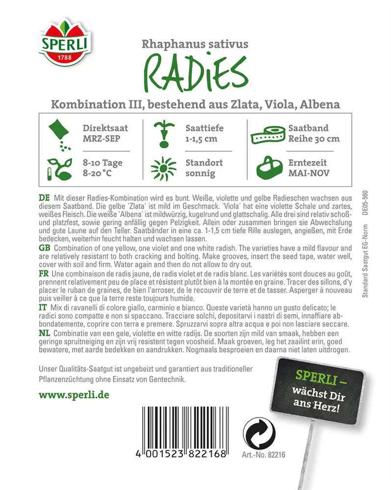 Die Radieschen Kombination 'Zlata, Viola, Albena' (Raphanus sativus var. sativus) bildet Knollen, die aromatisch schmecken und bereits ab Juni geerntet werden können. Für das optimale Wachstum der Radieschen Kombination 'Zlata, Viola, Albena' werden ein sonniger Standort und durchlässiger, nährstoffreicher Boden benötigt.