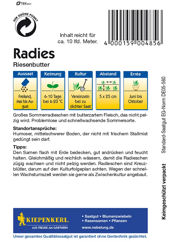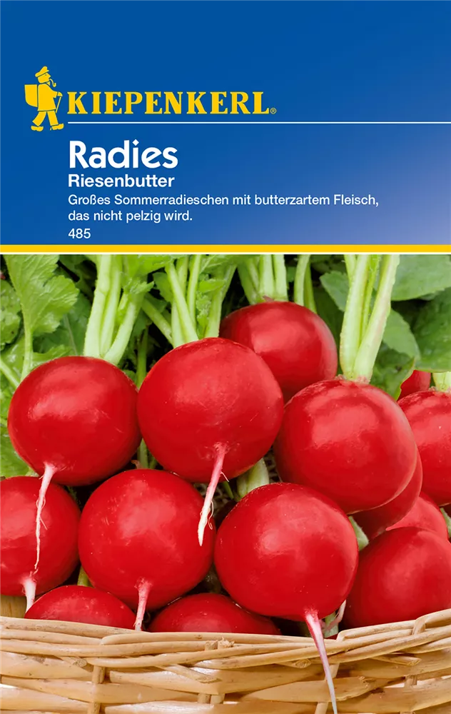 Das Radieschen 'Riesenbutter' (Raphanus sativus var. sativus) bildet Knollen, die aromatisch schmecken und bereits ab Juni geerntet werden können. Für das optimale Wachstum des Radieschens 'Riesenbutter' werden ein sonniger Standort und durchlässiger, nährstoffreicher Boden benötigt.