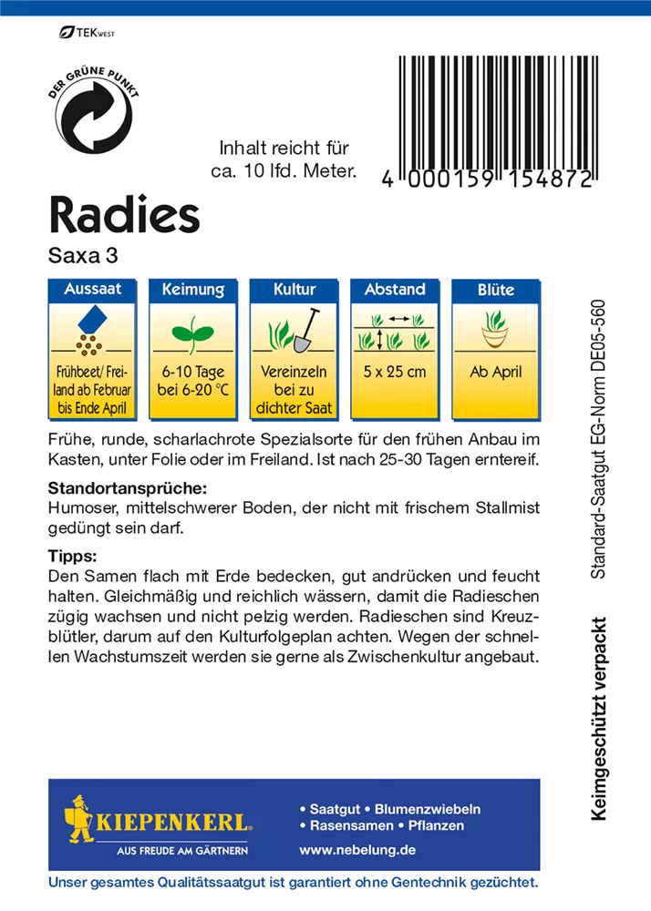 Samen 1 - 1,5 cm mit Erde bedecken. Die Keimung erfolgt innerhalb von 6 - 10 Tagen bei 6 - 20°C Bodentemperatur.
