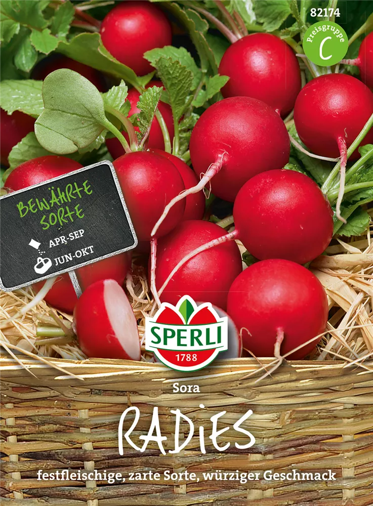 Das Radieschen 'Sora' (Raphanus sativus var. sativus) bildet Knollen, die aromatisch schmecken und bereits ab April geerntet werden können. Für das optimale Wachstum des Radieschens 'Sora' werden ein sonniger Standort und durchlässiger, nährstoffreicher Boden benötigt.