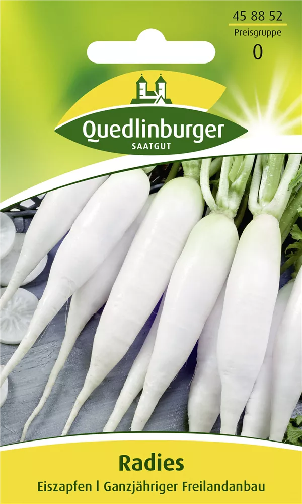Das Radieschen 'Eiszapfen' (Raphanus sativus var. sativus) bildet Knollen, die aromatisch schmecken und bereits ab Mai geerntet werden können. Für das optimale Wachstum des Radieschens 'Eiszapfen' werden ein sonniger Standort und durchlässiger, nährstoffreicher Boden benötigt.