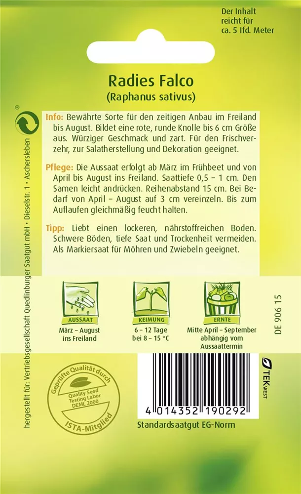 Das Radieschen 'Falco' (Raphanus sativus var. sativus) bildet Knollen, die aromatisch schmecken und bereits von Mai bis September geerntet werden können. Für das optimale Wachstum des Radieschens 'Falco' werden ein sonniger Standort und durchlässiger, nährstoffreicher Boden benötigt.
