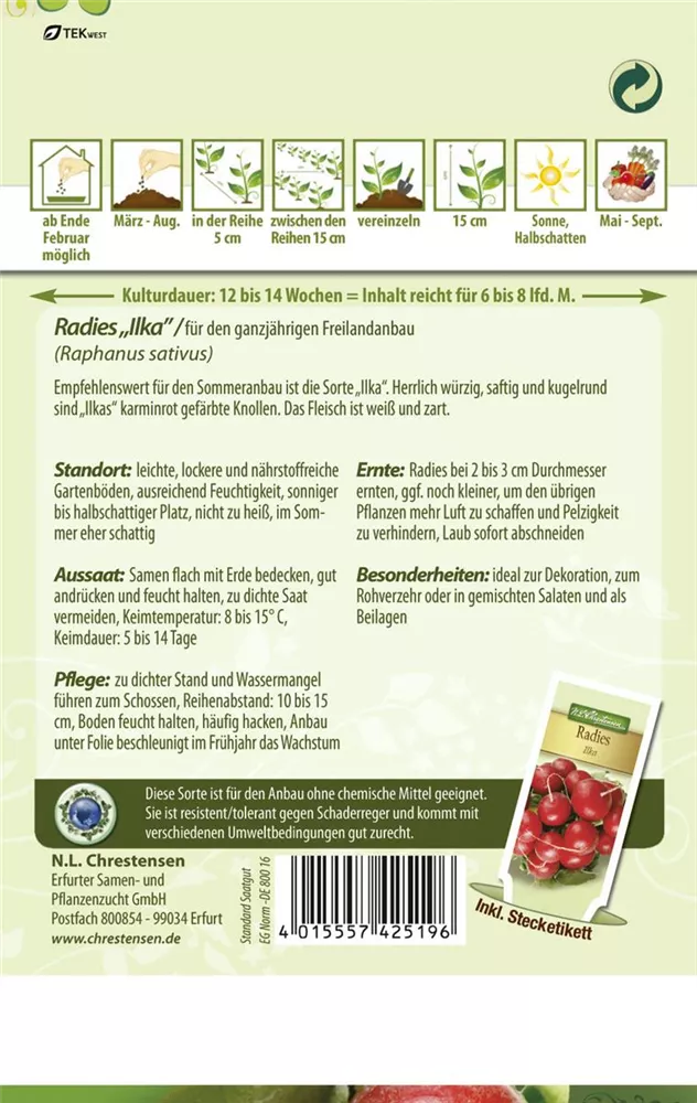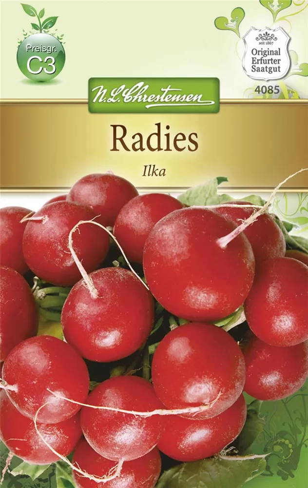Das Radieschen 'Ilka' (Raphanus sativus var. sativus) bildet Knollen, die aromatisch schmecken und bereits von Mai bis September geerntet werden können. Für das optimale Wachstum des Radieschens 'Ilka' werden ein sonniger Standort und durchlässiger, nährstoffreicher Boden benötigt.