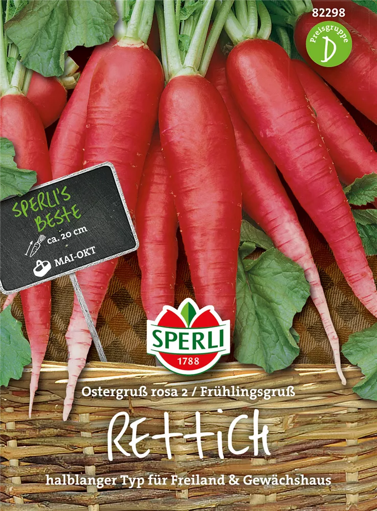 Der Rettich 'Ostergruß Rosa 2' (Raphanus sativus var. niger) bildet Wurzeln, die würzig schmecken und bereits ab Mai geerntet werden können. Für das optimale Wachstum des Rettichs 'Ostergruß Rosa 2' werden ein sonniger Standort und durchlässiger, nährstoffreicher Boden benötigt.