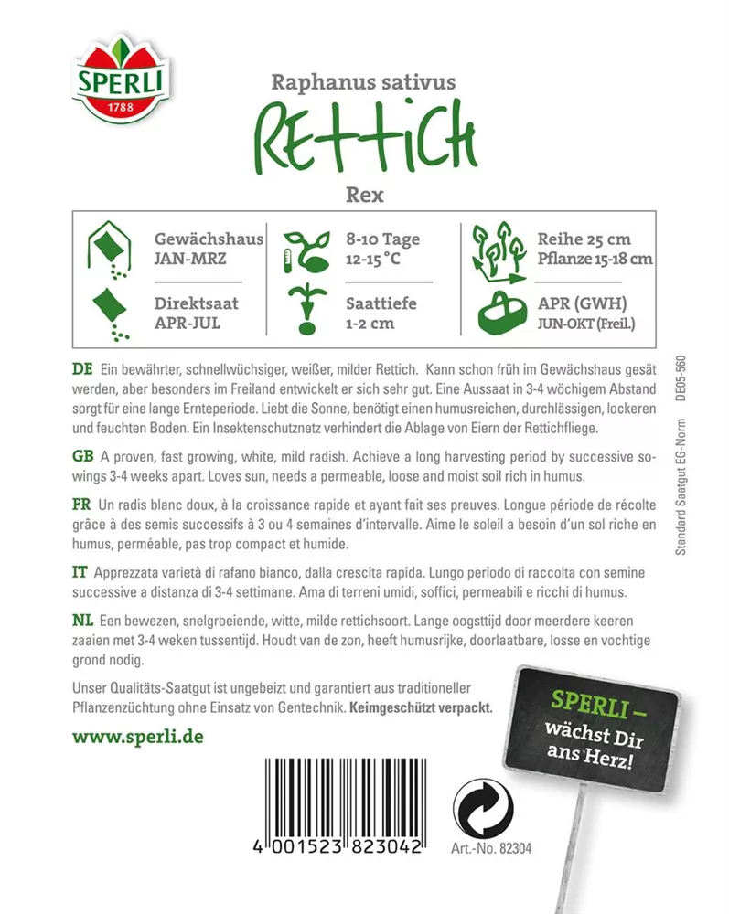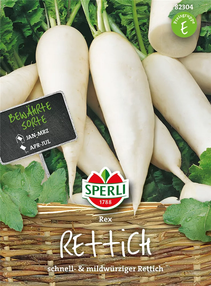 Der Rettich 'Rex' (Raphanus sativus var. niger) bildet Wurzeln, die würzig, mild schmecken und bereits ab März geerntet werden können. Für das optimale Wachstum des Rettichs 'Rex' werden ein sonniger Standort und durchlässiger, nährstoffreicher Boden benötigt.